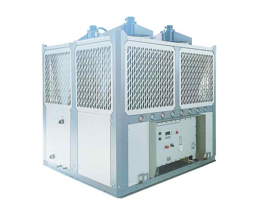 風冷式防爆型乙二醇低溫制冷機組通過風扇以空氣為冷凝方式的低溫控溫設備,單機輸出馬力從1HP~220HP;